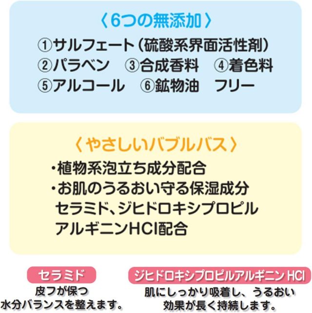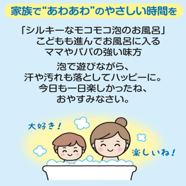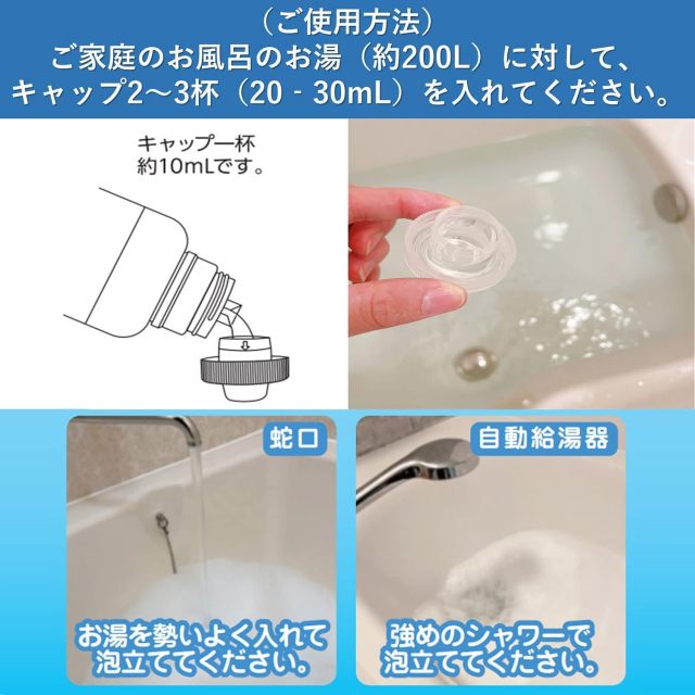 | 使用方法 | 浴槽に蛇口が付いている場合:キャップ2~3杯分(20~30ml)の本品を蛇口の真下に入れてからお湯を勢いよく入れて泡立ててください。浴槽に蛇口が付いていない場合:お湯を少量ためて、キャップ2~3杯分(20~30ml)の本品を入れてシャワーで泡立ててください。その後、適量のお湯をためてください。 |